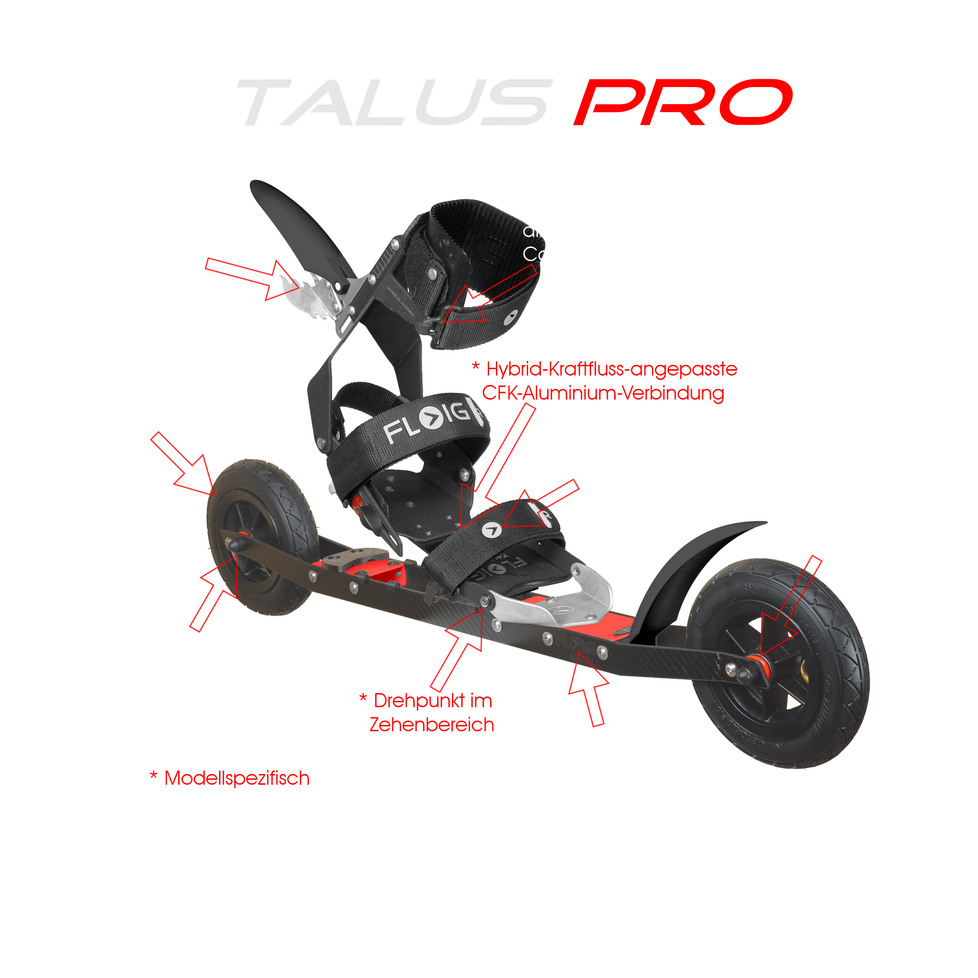 Für den klassischen Laufstil ist die freie Ferse unverzichtbar. Genau hier setzen die TALUS PRO Modelle an, denn bei diesen befindet sich der Drehpunkt für den Fersenhochgang im Zehenbereich und ermöglichen somit ein kompromissloses Fortbewegen im Diagonalschritt aber auch im Skatingstil. Da der Drehpunkt deutlich vorderhalb der Rollermitte sitzt, wurde eine Rückholfeder an der Unterseite verbaut - so ist auch Skating absolut kompromisslos damit zu laufen. Mit den 150x30er Rädern ist ein bereits geländetauglicher CrossSkate mit der Leichtigkeit eines Schirollers. Damit ist auch auf gröberem Asphalt ein komfortables Langlauferlebnis garantiert und auf glattem Asphalt sowieso. Der Fersenhochgang ist auch fixierbar.